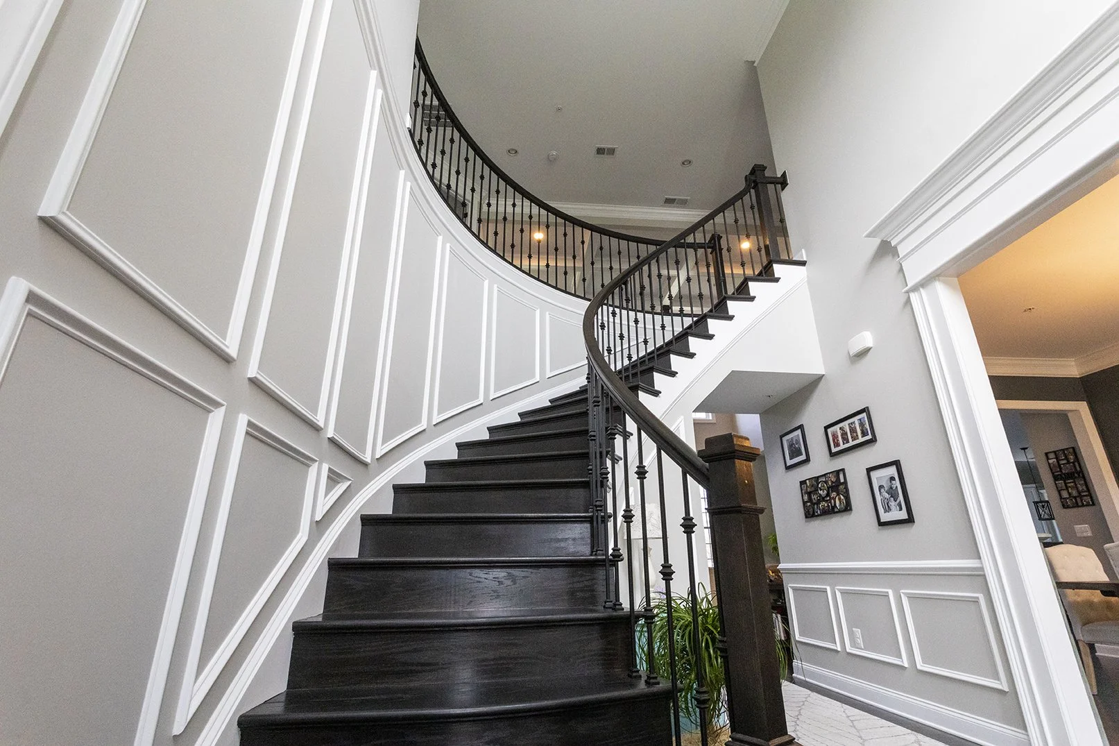 Curved foyer wall guiding movement toward two-story living room