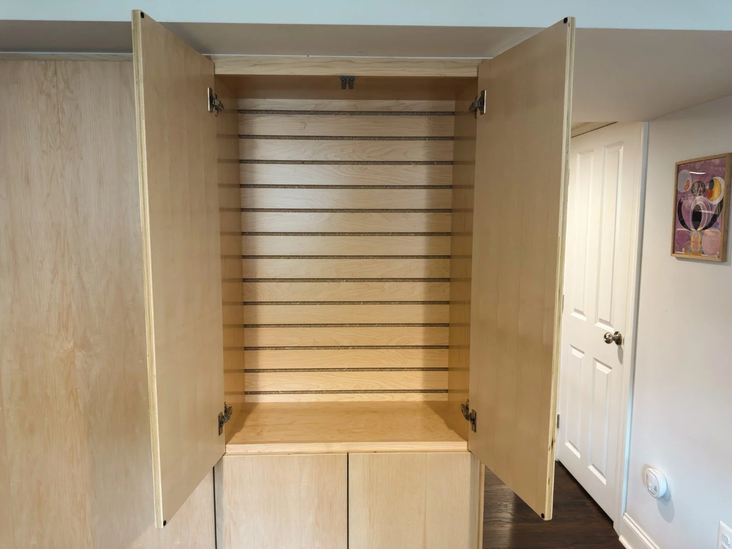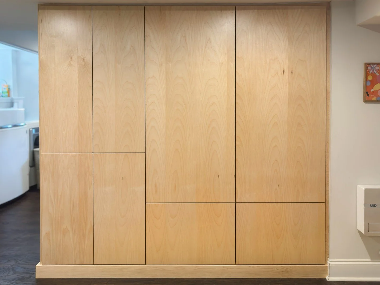 The built-in cabinetry was constructed from light maple plywood, finished to showcase the natural grain for a warm, modern look. Full-height slab doors keep the design streamlined, blending seamlessly into the basement while concealing the busy storage behind them. We added push-to-open hardware for a sleek, handle-free facade, combining style with easy functionality.